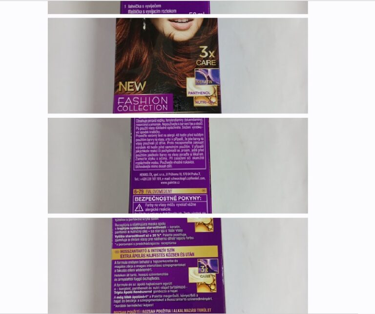 Η βαφή περιλαμβάνει ένα σωληνάριο βαφής 50 ml, έναν ενεργοποιητή 50 ml, μάσκα περιποίησης 10 ml και γάντια μίας χρήσης. Το προϊόν έχει παραχθεί στη Γερμανία και αφορά επίσημα την αγορά της Τσεχίας, όμως ενδέχεται να έχει διανεμηθεί και σε άλλα ευρωπαϊκά δίκτυα.
