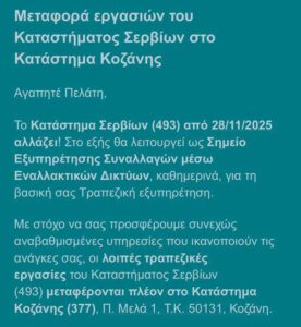 Οι βασικές τραπεζικές εργασίες θα εξυπηρετούνται πλέον από το κατάστημα Κοζάνης, με τη διοίκηση να κάνει λόγο για αναβάθμιση των παρεχόμενων υπηρεσιών και βελτίωση της εξυπηρέτησης των πελατών.