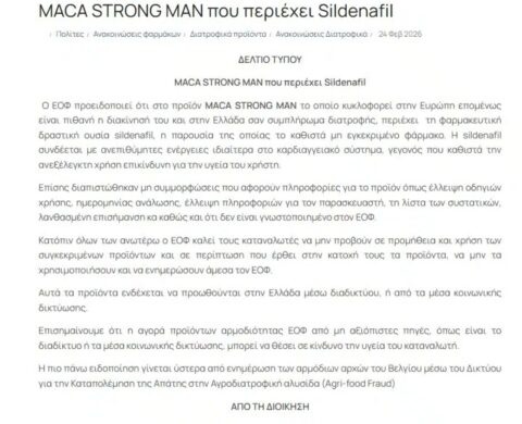 Πιο συγκεκριμένα ο Εθνικός Οργανισμός Φαρμάκων (ΕΟΦ) εξέδωσε προειδοποίηση προς τους καταναλωτές σχετικά με το προϊόν MACA STRONG MAN. Σύμφωνα με την ανακοίνωση το εξής προϊόν διακινείται ως συμπλήρωμα διατροφής στην ευρωπαϊκή αγορά και ενδέχεται να κυκλοφορεί και στην Ελλάδα.