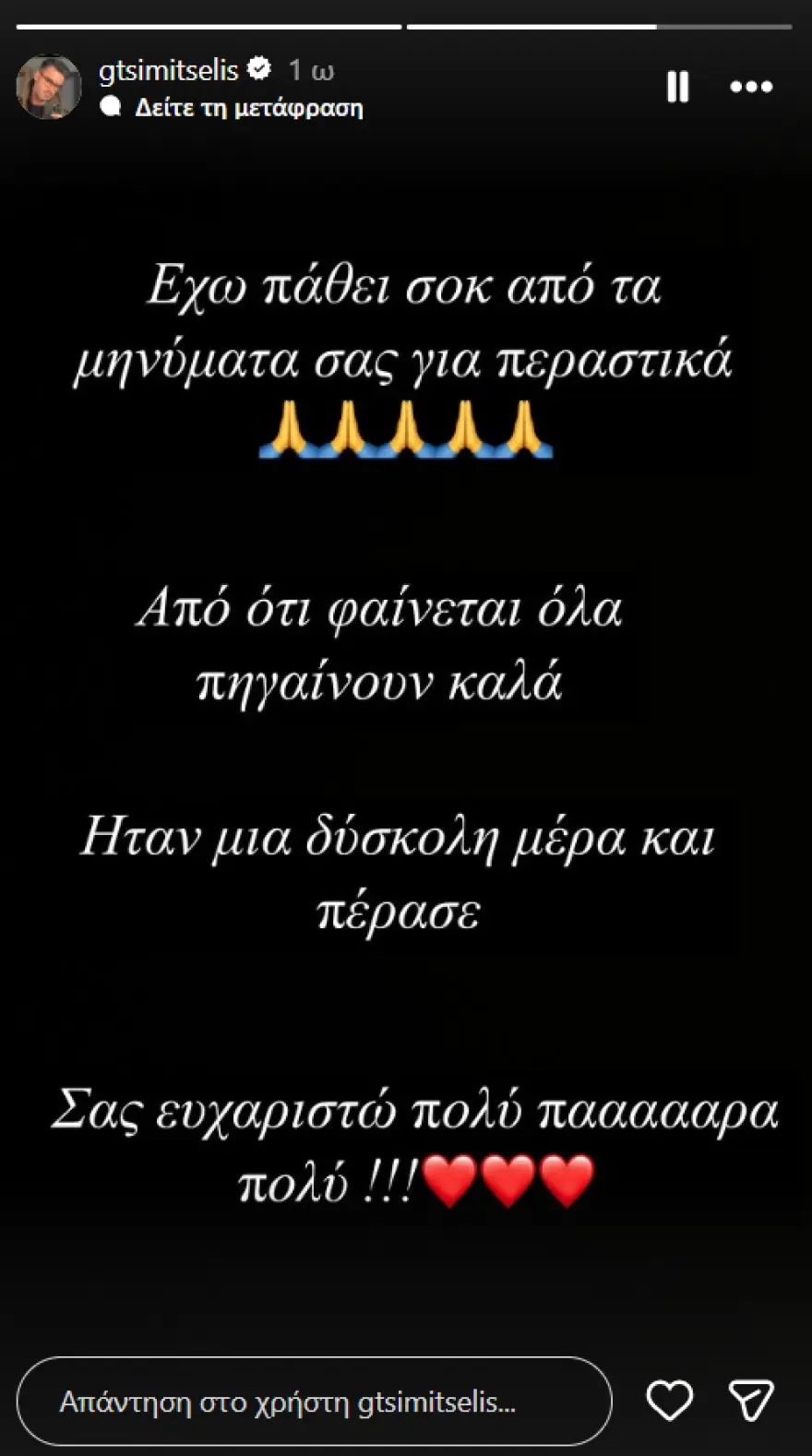 Μετά την έξοδό του από το νοσοκομείο, ο ηθοποιός δημοσίευσε νέα ανάρτηση, εκφράζοντας την έκπληξή του και την ευγνωμοσύνη του για τις ευχές του κόσμου: «Έχω πάθει σοκ από τα μηνύματα σας για περαστικά. Απ’ ότι φαίνεται όλα πηγαίνουν καλά. Ήταν μία δύσκολη μέρα και πέρασε. Σας ευχαριστώ πολύ, πάρα πολύ».