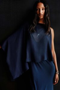 Ο σχεδιασμός του συνδυάζει κομψότητα και άνεση, ενώ το ασύμμετρο ύφασμα τύπου κάπα και οι διακριτικές πιέτες στο στήθος χαρίζουν κίνηση και φίνα αισθητική.