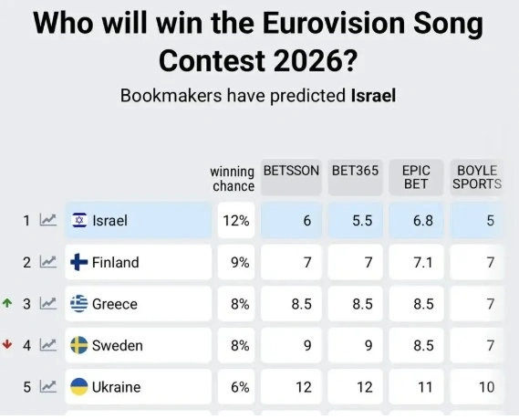 Το αποτέλεσμα είναι εντυπωσιακό: η Ελλάδα ξεπέρασε παραδοσιακές δυνάμεις του διαγωνισμού και πλέον φιγουράρει στην πρώτη τριάδα, πίσω μόνο από τη Φινλανδία (πιθανότητα νίκης 9%) και το Ισραήλ (12%), με τη διαφορά μεταξύ τους να θεωρείται οριακή.
