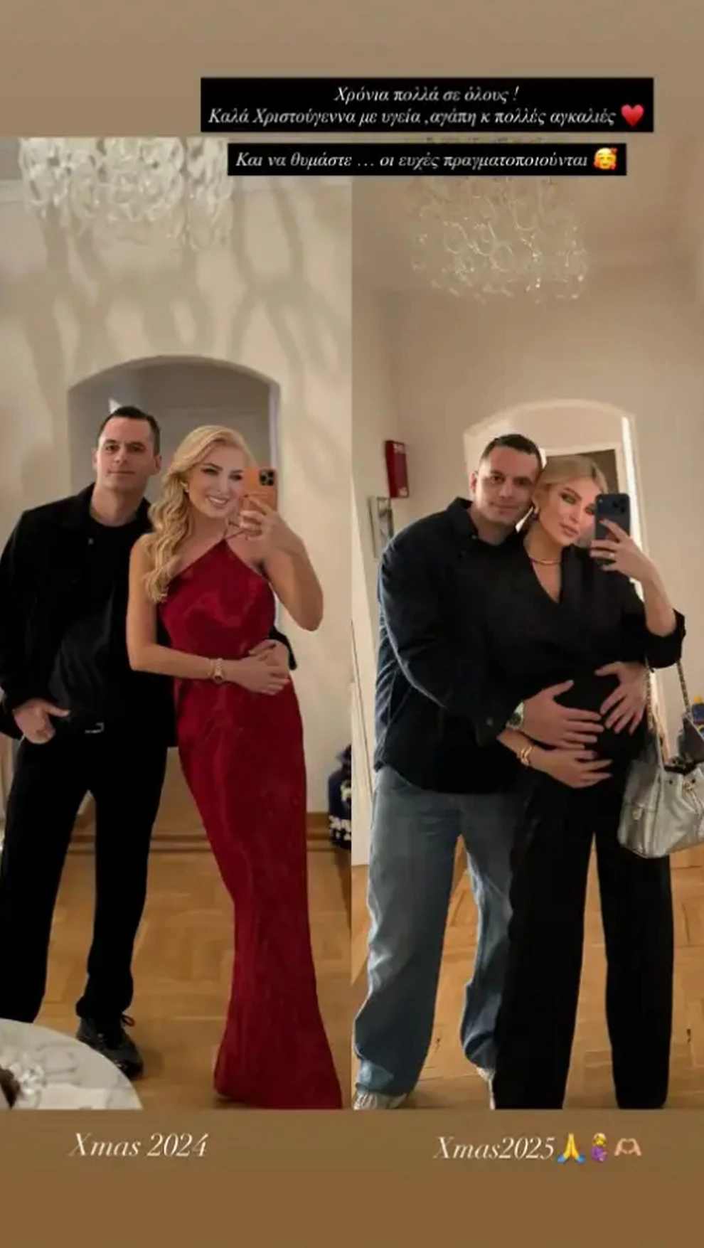 Η παρουσιάστρια δημοσίευσε ένα κολάζ με τις δύο φωτογραφίες και συνόδευσε την ανάρτηση με το μήνυμα: «Χρόνια πολλά σε όλους! Καλά Χριστούγεννα με υγεία, αγάπη και πολλές αγκαλιές. Και να θυμάστε… οι ευχές πραγματοποιούνται».
