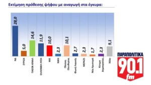 Στην πρόθεση ψήφου η ΝΔ λαμβάνει 23,7% έναντι 25,2% του προηγούμενου μήνα.
