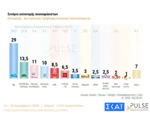 Νέα δημοσκόπηση έβγαλε η εταιρεία Pulse για λογαριασμό του τηλεοπτικού σταθμού του ΣΚΑΪ.